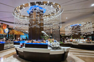 ภายในห้องอาหารตกแต่งสวยหรูดูแพง โดดเด่นด้วยคริสตัลแวววับห้อยระย้าสะดุดตามยามได้เห็น แต่ยังแฝงไปด้วยความอบอุ่นสไตล์คนไทย ที่ทำให้หลายๆชาติตกหลุมรัก ขณะที่ พื้นที่ภายในนั้น มีความกว้างขวาง พร้อมรองรับนักชิมได้จำนวนมาก แบบเป็นส่วนตัวและไม่แออัด ส่วนโซนอาหารนั้น ยังได้จัดวางพื้นที่อย่างลงตัว เป็นสัดส่วน สะดวกสบายในการเลือกตักอาหาร
