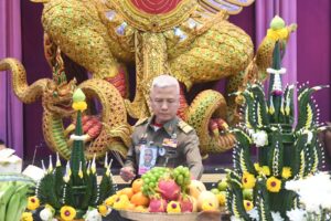 พันโท สมชาย กาญจนมณี รองเลขาธิการพระราชวัง และรองประธานกรรมการ มูลนิธิส่งเสริมศิลปาชีพในสมเด็จพระนางเจ้าสิริกิติ์ พระบรมราชินีนาถ พระบรมราชชนนีพันปีหลวง เป็นประธานในพิธีบวงสรวงเทพยดาครูอาจารย์