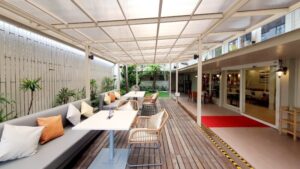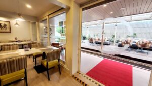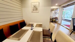 ขณะที่ บริเวณหน้าบ้านมีชาญบ้านกว้างๆ เป็นระเบียงที่จัดเรียงเก้าอี้ให้นั่งทานอาหารและรับลมในช่วงแดดร่มลมตก ให้ได้พักผ่อนกันแบบสบายๆ สำหรับพื้นที่ภายในตัวบ้านเอง ทางร้านได้จัดพื้นที่ให้ดูโล่งโปร่งมากขึ้น มีโต๊ะ เก้าอี้ ตั้งไว้เป็นสัดส่วน นอกจากนี้ บนชั้น 2 ยังมีห้องวีไอพีจำนวน 10 ที่นั่ง สำหรับผู้ที่ต้องการความเป็นส่วนตัว ซึ่งทั้งหมด มีจำนวนที่นั่งกว่า 100 ที่นั่ง