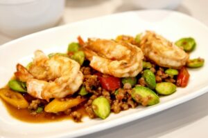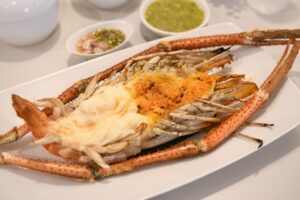 ขณะที่ สะตอผัดกุ้ง รสชาติเข้มข้นสไตล์ปักษ์ใต้ รับรองว่าหรอยจังหู้ และพิเศษสุดของมื้อวันนี้คือ กุ้งแม่น้ำเผาไซส์จับโบ้ ขนาด 2 ตัวหนึ่งกิโลกรัม รับประกันความอร่อย เสิร์ฟมาพร้อมกับน้ำจิ้มสองชนิดให้เลือกอร่อยตามใจชอบ