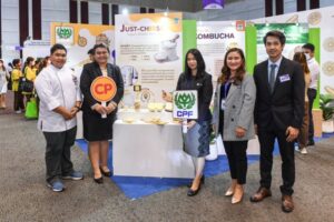 ภายในบูธของ CPF RD Center นำเสนอ 3 ผลงานวิจัยด้านอาหาร ประกอบด้วย Just-Cheese ชีสวีแกนทำจากปลายข้าวหมักด้วยกระบวนการชีวภาพด้วยเชื้อยีสต์สายพันธ์คัดแยกพิเศษที่ให้กลิ่นและอะมิโน เป็นผลพลอยได้จากกระบวนการสีข้าวที่มีมูลค่าน้อยลง แต่ยังอุดมด้วยโปรตีน แร่ธาตุ ไขมัน และวิตามิน การแปรรูปเป็น “ชีส” ไขมันต่ำ มีคุณค่าโภชนาการสูง ช่วยตอบโจทย์คนรุ่นใหม่ที่ชื่นชอบชีส และผู้ที่รับประทานมังสวิรัติ ขณะเดียวกัน ยังมีรสชาติอร่อยเหมือนชีสที่ทำจากนม เพิ่มทางเลือกให้กับผู้ที่แพ้นม ได้อีกด้วย