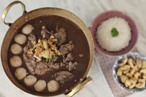 ขณะที่อาหารขึ้นชื่อ อีกอย่างหนึ่งคือ กากหมูจิ้มแจ่ว โดยใช้กากหมูที่ร้านเจียวเอง เอาน้ำมันออกด้วยการทอดถึง 3 ครั้ง เท่ากับเป็นการรีดน้ำมันออกให้หมดจนเหลือไว้แต่ความกรอบ ความหอม กินควบคู่กับน้ำจิ้มแจ่ว รวมถึง เมนูส้มตำ ไก่ย่าง ที่ต้องมาลองด้วยตัวเองสักครั้ง