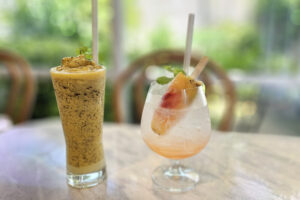 รวมถึงเมนู ของหวานสไตล์ตะวันตกที่หลอมรวมกับเป็นตะวันออกได้อย่างลงตัว นั่นก็ คือ เครมบรูเล่ มะพร้าวอ่อน สัมผัสที่ละมุนนุ่มลิ้น แทรกด้วยเนื้อมะพร้าวอ่อน จะหลงเสน่ห์ของหวานจานนี้ อย่างไม่รู้ตัว และเมนูอาหารอร่อยทั้งหมดอีกเกือบถึง 50 เมนู ส่วนใครที่เดินทางมาร้อนๆ ทางร้านแนะนำเครื่องดื่ม เรียกความสดชื่น ไม่ว่าจะเป็นชา กาแฟ น้ำผลไม้ปั่น เพื่อสุขภาพ น้ำมะนาวโซดา, พีชแอนด์โรส ก็เรียกได้ว่า ครบครัน