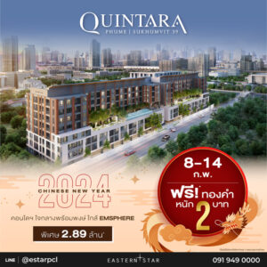 ไฮไลท์ของ ESTAR เดือนนี้ บริษัทจับโครงการคุณภาพ บนทำเลใจกลางเมือง ขยายเวลาโปรฯ นำเสนอลูกค้า ได้แก่ โครงการเอสทารา เฮเว่น พัฒนาการ 20 ทาวน์โฮม 3 ชั้น ทำเลไม่เป็นสองรองใครใจกลางพัฒนาการ เดินทาง 10 นาทีถึงทองหล่อ ด้วยราคาพิเศษ เริ่มต้นที่ 15.99 ล้านบาท* ที่ต้นปีนี้เหลือเพียง 8 ยูนิตสุดท้ายแล้ว ทำเลถัดมาเป็นย่านพร้อมพงษ์ โครงการควินทารา ภูม สุขุมวิท 39 คอนโดห้องพร้อมอยู่ ให้ทุกท่าน “ใช้ชีวิตได้ดั่งใจ ที่ใจกลางพร้อมพงษ์” ราคาพิเศษล็อตสุดท้ายเริ่มต้น 2.89 ล้านบาท แถมจองวันนี้ – 29 ก.พ. 67 แจกทันทีทองคำหนัก 2 บาท*